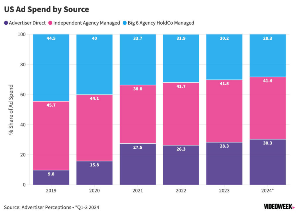 בשוק הפרסום האמריקאי ניכרת לאחרונה תפנית משמעותית: יותר הוצאות פרסום מגיעות כיום ישירות מהמותגים, ולא דרך חברות ענק שמאגדות תקציבים, כשה‑AI משחק תפקיד מכריע במהפכה הזו. לפי מחקר של Advertiser Perceptions, ב־2019 כמעט מחצית מההוצאות על פרסום הוצאו דרך שש החזקות הגדולות — אך עד 2024, נתון זה צנח ל‑28%, כאשר המותגים השקיעו ישירות כ‑30% מכלל ההוצאות, ואצלם מדובר כעת בשחקן הגדול יותר משוק החברות המסורתיות.