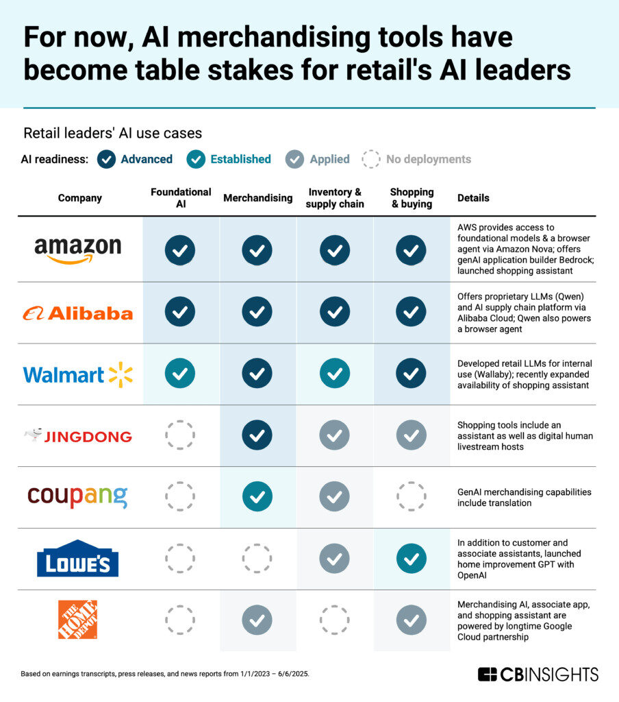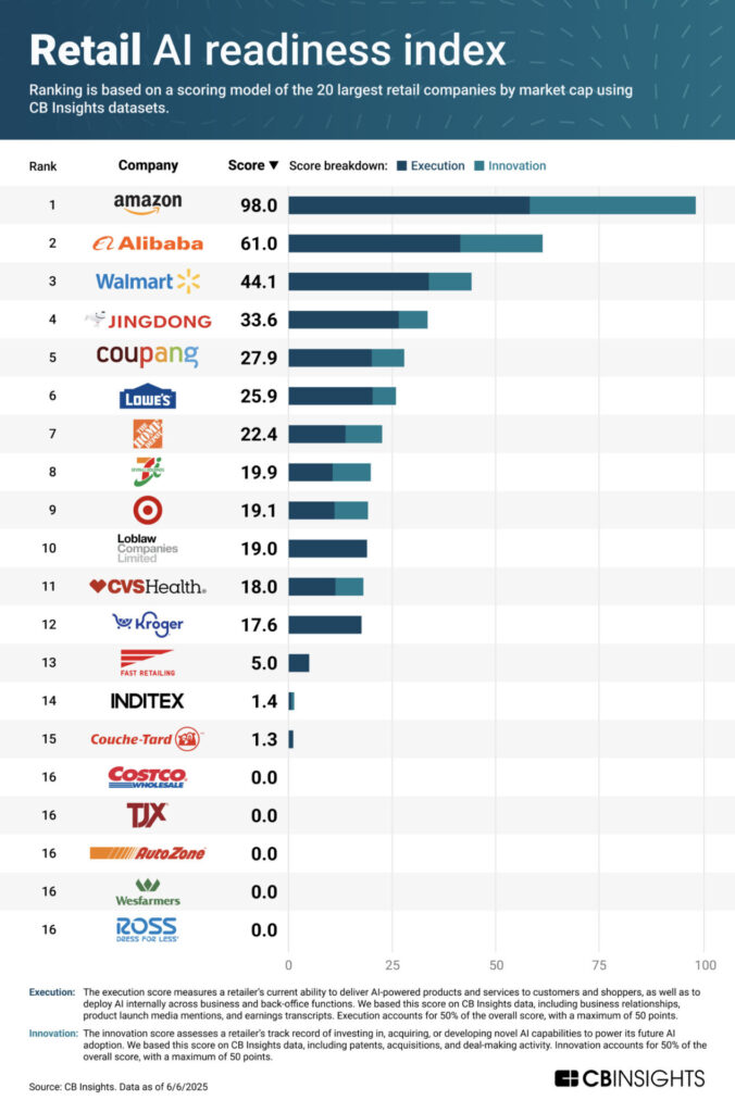 הקמעונאות העולמית מתכוננת לעידן שבו AI כבר לא "nice to have" אלא חלק מה־DNA העסקי. ניתוח חדש של חברת המחקר CB Insights מדרג את השחקנים הגדולים לפי רמת המוכנות שלהם ליישום בינה מלאכותית — והתמונה ברורה: מתוך 20 הקמעונאים הגדולים בעולם, מי שיש לו תשתית פנימית חזקה רץ קדימה, ומי שלא? נאלץ לאמץ שותפויות חיצוניות כדי להישאר במשחק.