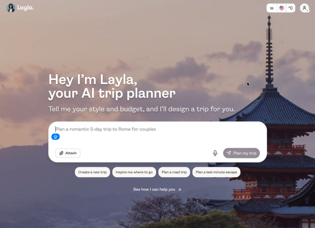 אחת הדוגמאות הברורות לכך היא Layla, אתר תיירות שמוותר כמעט לחלוטין על חיפוש קלאסי ופילטרים. במקום לבחור יעד או תאריך, המשתמש מתאר מה הוא מחפש להרגיש, חופשה רגועה, הרפתקה, זמן איכות, והמערכת בונה מסלול שלם דרך שיחה. החוויה לא מרגישה כמו שימוש באתר הזמנות, אלא כמו שיחה עם מתכננת נסיעות חכמה שמבינה הקשר, מעדכנת המלצות תוך כדי ומובילה לפעולה.