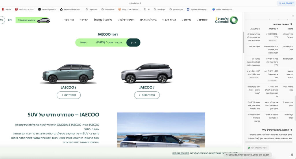 שתי דוגמאות לשימוש בכלי ה-AGENT המובנה בדפדפן: באתר של יבואנית הרכב כלמוביל, הסוכן התבקש לנתח שני דגמים של המותג JAECOO ולאחר השוואה להמליץ על החלופה המתאימה עבורי: