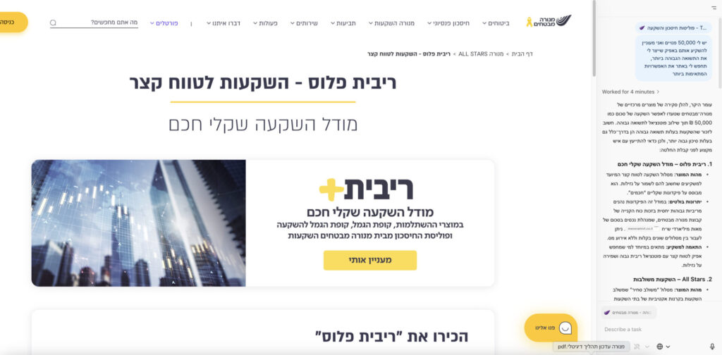 דוגמה נוספת: באתר של חברת מנורה מבטחים, כתבתי ל-AGENT שיש לי 50,000 ש"ח פנויים ואני מעוניין להשקיע אותם באפיק ששייצר לי את התשואה הגבוהה ביותר. ה-AGENT עבר על חלקים נרחבים של האתר, בחן את המוצרים השונים, המאפיינים שלהם ואפילו את תהליכי ההצטרפות ופירט בחזרה את החלופות השונות, היתרון והסיכון בכל חלופה ולבסוף את המוצרים המתאימים ביותר להגדרה שנתתי לו: